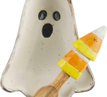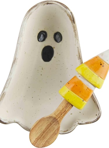Ghost shaped serving dish with candy corn serving spoon will take on any of your serving needs!